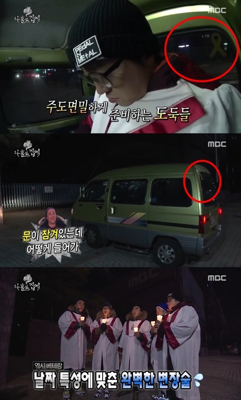 10일 방송된 MBC 예능 프로그램 ‘무한도전-나 홀로 집에’ 특집에서 유재석 박명수 정준하 정형돈 하하 등 다섯 멤버는 도둑으로 변신해 텅 빈 여의도 MBC 건물을 찾았다. 차를 타고 가는 길에 경찰차를 발견하고 괜스레 어색해하는 등 어설픈 도둑연기가 웃음을 자아냈다.