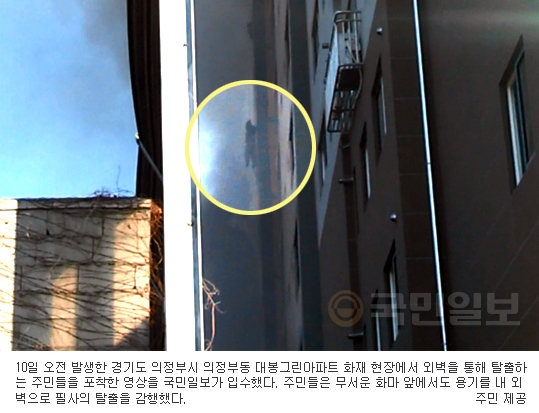 10일 오전 발생한 경기도 의정부시 의정부동 대봉그린아파트 화재 현장에서 외벽을 통해 탈출하는 주민들을 포착한 영상을 국민일보가 보도했다.