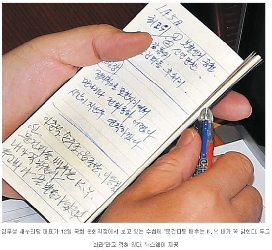 문건 파동 배후 논란은 지난 12일 국회 본회의장에 참석한 김 대표의 수첩 메모가 인터넷매체 뉴스웨이 카메라에 포착되면서 점화됐다. 메모에는 이준석 손수조 음종환 이동빈의 이름과 함께 ‘문건파동 배후는 K, Y. 내가 꼭 밝힌다. 두고 봐라. 곧 발표가 있을 것’이라는 글이 적혀 있었다. 정치권에선 즉각 K와 Y가 누구인지를 두고 온갖 추측이 나왔다.