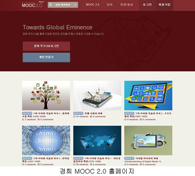 한편 2013년 3월 사이버대학 전체 구성원 연찬회 발표를 통해 첫 걸음을 뗀 ‘경희 MOOC 2.0’은 같은 해 6월 경희 온라인 캠퍼스 구축 태스크포스(TF)를 형성한 후 기후변화, KF한국학 , 모바일관련 강좌 등 총 12개 과정을 탑재한 경희 무크 플랫폼 1단계를 구축했다. 이후 7월 경희 무크 플랫폼 알파 버전 사용과 테스트를 2주간 진행했고, 이후 파일럿 프로젝트를 운영하면서 운영 정책, 과정 개발, 플랫폼 고도화 등 프로젝트의 미비점을 계속 보완하고 있다.
