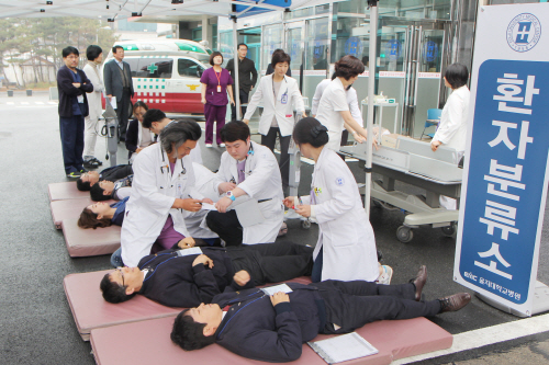 훈련은 재난발생시 환자유입에 따른 조치를 시작으로 ▲재난발생 상황 확인 및 접수, ▲ 병원입구 통제선 설치, ▲응급의료 진료부 설치, ▲환자분류소, 임시영안실 설치, ▲부상자 응급처치 및 환자이송, ▲병원비상체계가동으로 인력증원 등 실전과 같은 상황으로 진행됐다.