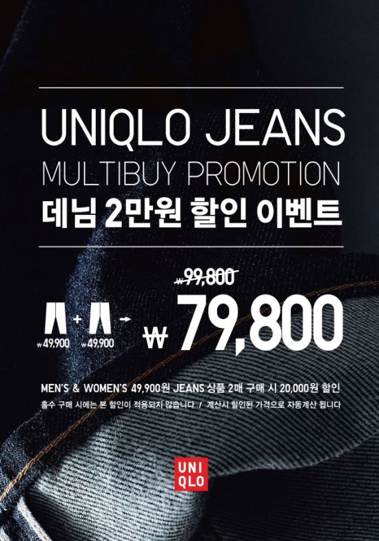[쿠키뉴스=김 난 기자] 글로벌 SPA 브랜드 유니클로(UNIQLO)가 데님 상품 일부 중 2매를 구매 시 2만원을 할인하는 파격적인 ‘데님 2만원 할인 이벤트’를 오는 29일까지 진행한다.