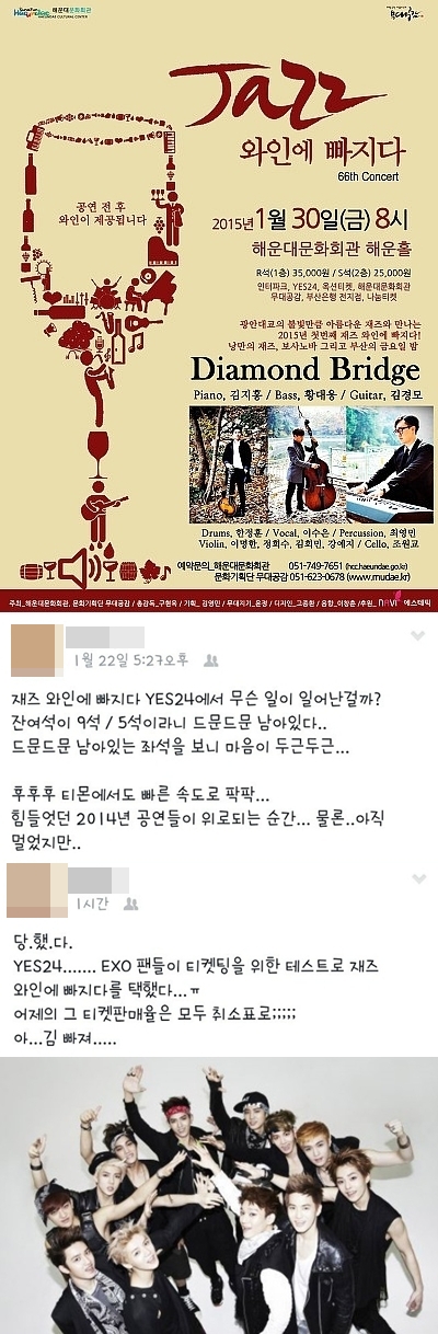 네티즌 A씨는 23일 자신의 블로그에 부산의 대표적인 재즈 공연이 엑소 팬들의 희생양이 됐다는 고발 게시물을 올렸다. 다음달 열리는 엑소 콘서트 예매를 위해 일종의 예행 연습으로 재즈 공연 티켓을 예매한 것.
