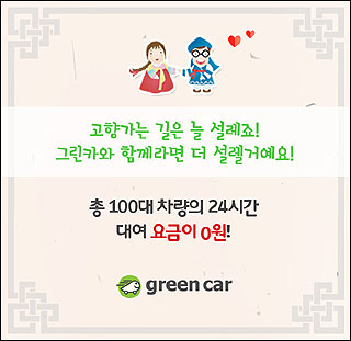 [쿠키뉴스=박주호 기자] 설날 연휴가 다가오자 고향 가는 버스 및 기차 표를 구하고자 하는 귀성객들의 표 구하기 전쟁이 시작된 가운데 카셰어링 서비스 그린카는 귀성객들의 즐거운 고향 방문을 위해 ‘설날 연휴 사전 예약 이벤트’를 진행한다고 26일 밝혔다.