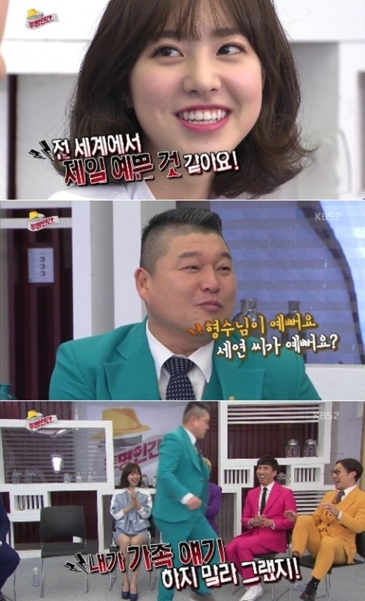 이에 하하가 “형수님이 예쁜가, 진세연이 예쁜가”라고 묻자 강호동은 “가족 얘기는 하지 말라. 한 번 웃기려고 저런다”라며 발끈하며 하하의 정강이를 걷어차 웃음을 자아냈다.