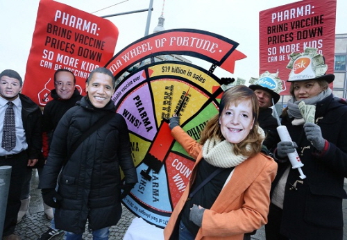 유럽 현지시간으로 27일 오전 베를린 의회센터(Berlin Congress Center) 앞에서 메르켈 독일 총리, 오바마 미국 대통령, 캐머런 영국 총리로 분장한 국경없는의사회의 자원봉사자들이 모여 ‘제약업계 운명의 수레바퀴’ 행사를 벌였습니다.