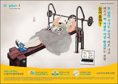 광고 카피도 라이프플래닛만의 젊고 발랄한 느낌을 살려 구성했다. 한복을 입고 역기를 드는 여성 옆에 ‘한 달만 지나도 수익이 바로 나서 해지 시 100% 이상 환급되는 보험, 들어볼까?’라는 문구로 보험과 역기를 ‘든다’는 중의적인 표현이 연상되도록 했다.
