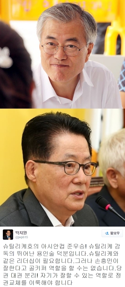 박 의원은 지난달 31일 한국과 호주의 아시안컵 결승전이 끝난 직후 자신의 트위터에 “슈틸리케호의 아시안컵 준우승! 슈틸리케 감독의 뛰어난 용인술 덕분입니다. 슈틸리케와 같은 리더십이 필요합니다”라며 “그러나 손흥민이 잘한다고 골키퍼 역할을 할 수는 없습니다. 당권 대권 분리! 자기가 잘할 수 있는 역할로 정권교체를 이룩해야 합니다”라고 적었다. 당권과 대권을 손흥민, 김진현에 비유한 셈이다.