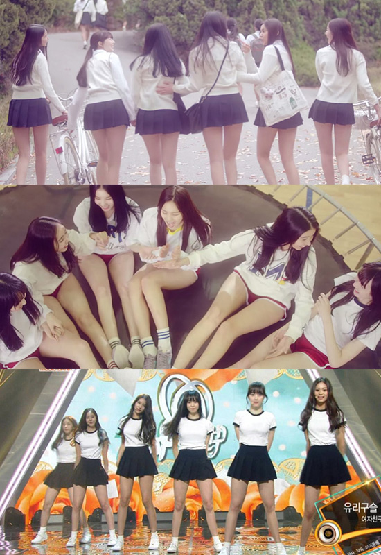 공개된 사진에는 여자친구 뮤직비디오 속의 멤버들 뒷모습과 트램펄린 위에서 나란히 앉아 수다를 떠는 장면, 그리고 데뷔무대 모습을 통해 멤버들의 돋보이는 비율이 눈길을 끕니다.