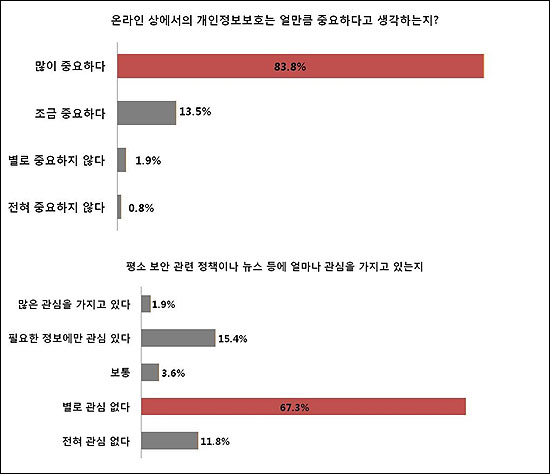 [쿠키뉴스=박주호 기자] 대한민국 성인 10명 중 8명은 온라인상에서 개인정보보호에 대해 매우 민감하지만, 정작 관련 정책이나 뉴스 등에는 관심이 없는 것으로 조사됐다.