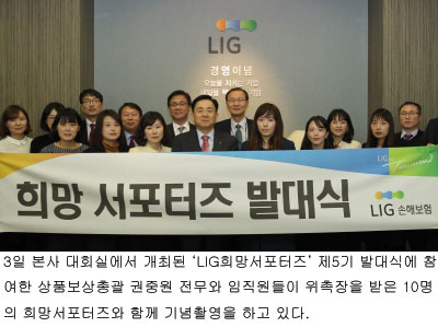 LIG손해보험은 3일 서울 역삼동 소재 본사 대회의실에서 공식 고객 패널단인 ‘LIG희망 서포터즈’ 제5기 출범식을 개최하고 본격적인 활동에 들어간다고 밝혔다.