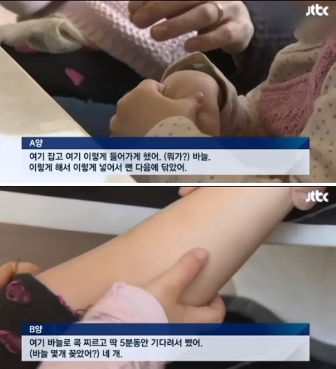 jtbc는 4일 ""어린이집에 다니는 같은 반 아이들 10여 명의 손과 발에서 바늘로 찍힌 자국이 발견됐다""고 학대 의혹을 보도했다. 남양주시 화도읍에 사는 A양(6)의 손등엔 날카로운 바늘로 찌른 듯한 상처가 있었다. A양은 인터뷰에서 ""여기 잡고 여기 이렇게 들어가게 했어. 바늘이. 이렇게 해서 이렇게 넣어서 뺀 다음에 닦았어""라고 말했다.