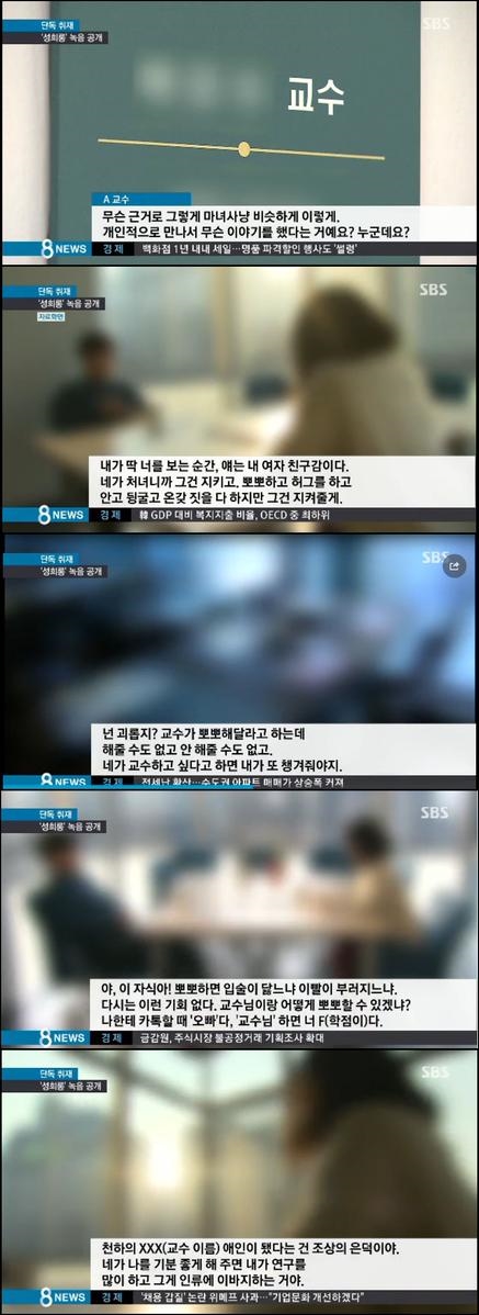 SBS는 5일 서울대 경영학과 A 교수가 저녁 식사를 하며 여학생에게 건넨 말을 담은 녹음 파일을 보도했다. 대화를 녹음한 학생들은 강요된 식사 자리에서 불미스러운 일이 생길 것을 우려해 녹음했다고 밝혔다. 이 안에는 믿기 어려운 성희롱적인 표현이 고스란히 담겨 있다.
