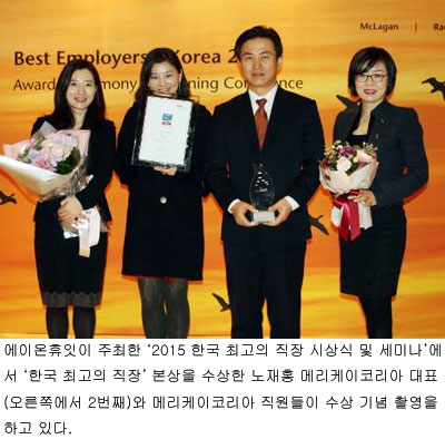 [쿠키뉴스=박주호 기자] 코스메틱 브랜드 메리케이코리아가 글로벌 인사관리 전문컨설팅 기업 에이온휴잇이 주최한 ‘2015 한국 최고의 직장(Best Employers in Korea)’에서 본상을 수상했다.