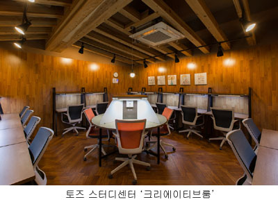 ‘토즈 스터디센터’는 학습자의 성향에 따른 최적화된 공간을 제공해 차별화된 공간 서비스를 제공한다. 혼자 있는 공간에서 집중이 되지 않는 학습자를 위한 오픈스터디룸, 시각적인 환경에 민감한 학습자에게 시각적인 안정감을 주는 크리에이티브룸 등의 학습 성향을 고려한 5가지 공간으로 구성돼 있다.