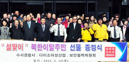 [쿠키뉴스=김 난 기자] 다이소아성산업은 구정을 맞아 지난 12일 서울 강남구 수서경찰서에서 관내 북한이탈주민과 저소득층 주민 300여 명에게 다이소 생활용품을 나누는 ‘설 맞이 선물나눔 행사’를 진행했다.