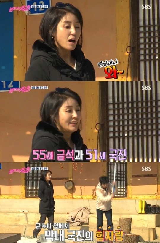 장작 패기에 몰두한 김국진은 이내 도끼로 내리쳐 장작을 쪼갰다. 이에 양금석은 “마른 장작이 세다더니 국진이 쎄다”라고 칭찬했다.