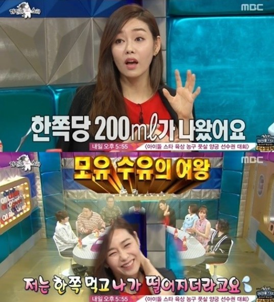 박탐희는 다른 출연진들에게 모유 수유 양을 물어보며 “전 한쪽당 200㎖가 나왔다”고 거침없이 말했다. 이에 MC 김구라는가 “기억이 잘 안 나서 그러는데 모유 수유 할 때 번갈아가면서 하느냐”고 묻자 박탐희는 “그렇다. 근데 (우리 아기는) 한쪽 먹고 나가떨어지더라”고 대답해 웃음을 자아냈다.