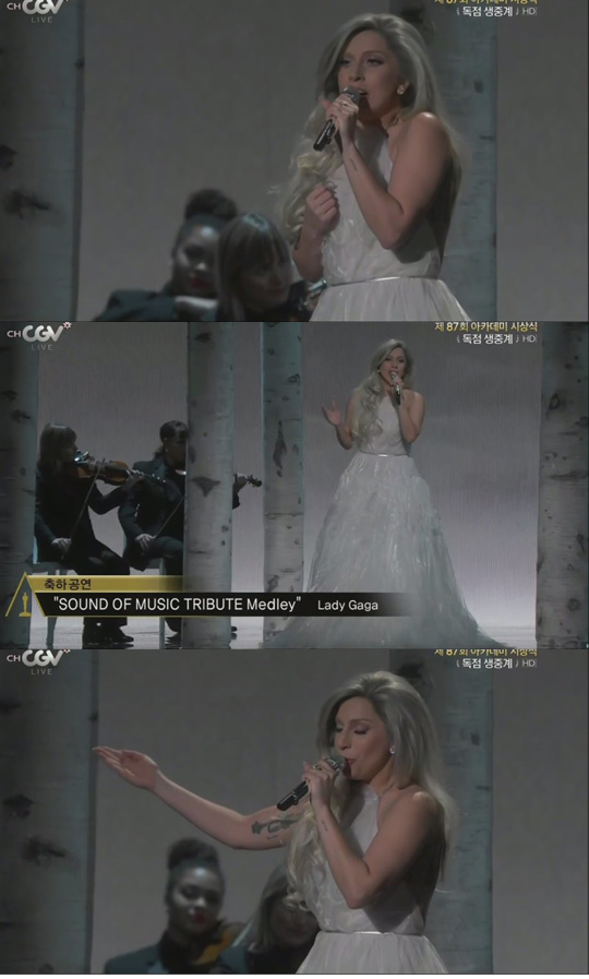 22일(현지시간) 미국 로스앤젤레스 돌비 극장에서 열린 제87회 아카데미 시상식에서 레이디 가가는 새하얀 드레스를 입고 등장했다. 긴 금발 웨이브 머리를 늘어뜨리고 단아한 모습으로 무대에 선 레이디 가가는 ‘사운드 오브 뮤직 트리뷰트 메들리(Sound of Music Tribure Medley)’를 불렀다. 영화 ‘사운드 오브 뮤직’ OST들을 메들리로 엮은 무대였다.