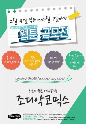 조디악코믹스 관계자는 “이번 웹툰 공모전은 새로운 웹툰 작가를 개발하기 위해 열리는 것”이라며 “2월 4일부터 4월 1일까지 조디악코믹스 티저 페이지(www.zodiaccomics.com)에 자유연재를 3화 이상할 경우 자동 응모된다”고 말했다.