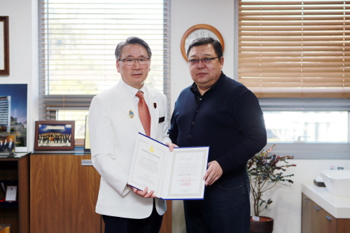 [쿠키뉴스=김단비 기자] 고려대학교 안암병원 김영훈 원장이 몽골 인구개발사회복지부 에르덴(S.Erdene) 장관으로부터 몽골 최고 영예의 상과 감사장을 전달받았다.