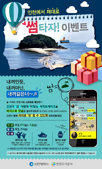 [쿠키뉴스=송병기 기자] 인천광역시와 인천도시공사는 봄을 맞아 인천의 섬을 대표할 수 있는 ‘캐치프레이즈’ 선정을 위한 온라인 이벤트 ‘인천에서 제대로 썸 타자’를 오는 3월1일부터 2주일 동안 실시한다.