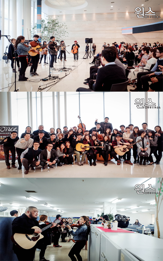 신청자의 바람대로 전 직원이 함께 할 수 있는 로비에서 진행된 ‘오피스 버스킹’은 ‘원스’의 대표 곡인 ‘Falling Slowly’, ‘When your mind’s made up’ 부터 대중가요까지 다양한 음악으로 약 40여분간 꾸며졌고, 현장을 찾은 100여명의 직원들은 열렬한 환호와 박수로 ‘원스’ 배우들에게 화답하며 음악으로 하나가 되는 즐거운 시간을 가졌습니다.