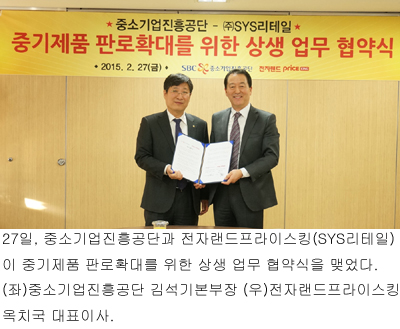 [쿠키뉴스=박주호 기자] 전자랜드프라이스킹은 27일 중소기업진흥공단(이하 중진공)과 중소기업 제품의 판매 활성화와 유통망 확대를 위한 ‘상생’ 업무협약(MOU)을 체결했다고 밝혔다.