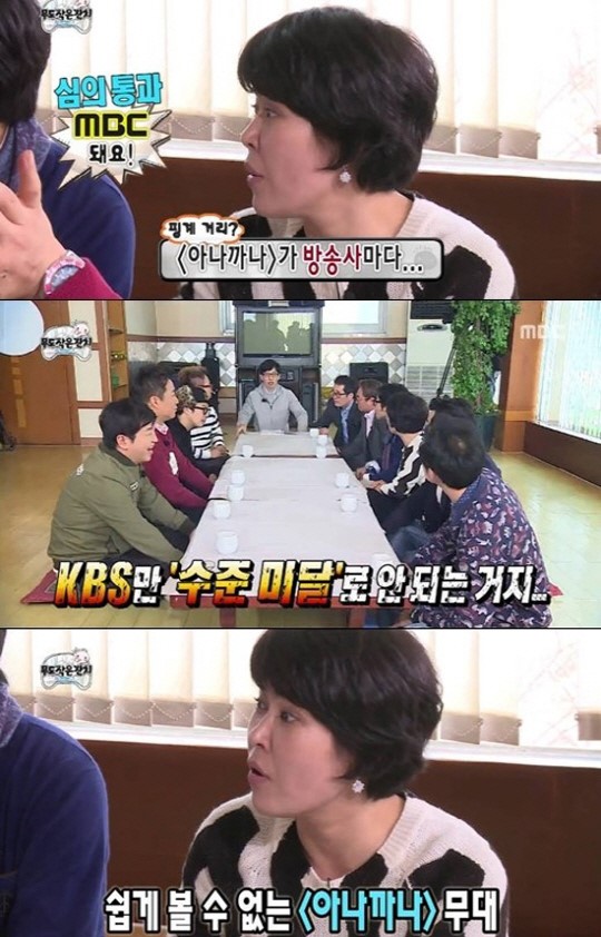당황한 유재석은 “‘아나까나’가 방송에 나올 수 없는 것으로 알고 있다”고 했다. 이에 조혜련은 “MBC는 심의 통과가 됐다”며 “KBS만 수준 미달로 안 되는 것”이라고 응수해 웃음을 자아냈다.
