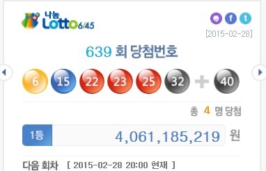 [쿠키뉴스=권남영 기자] 나눔로또는 제639회 로또복권 1등 당첨번호는 ‘6, 15, 22, 23, 25, 32’ 등 6개라고 28일 밝혔다. 2등 보너스 번호는 ‘40’이다.