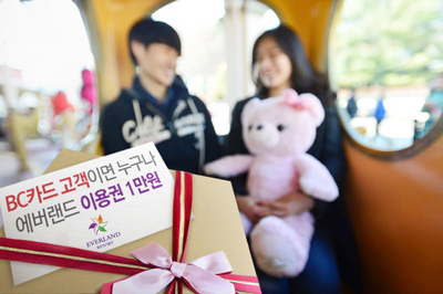 이 달 31일까지 BC카드를 소지한 손님 누구나 에버랜드 이용권을 1만원에 구입할 수 있다. 카드의 종류나 전월 이용실적과 상관없이 모든 BC카드 소지 손님들에게 적용되며, 에버랜드 내 홈페이지 우대 쿠폰을 출력해 오면 동반 3인까지 에버랜드 이용권이 약 30% 할인 된다.