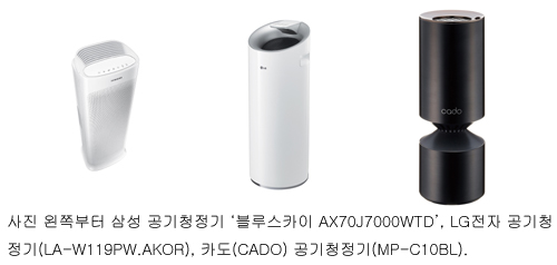 최근 출시된 공기청정기는 생활 오염물질 제거는 물론 0.02㎛(마이크로미터) 입자의 초미세먼지까지 헤파필터로 99.9% 걸러준다. 삼성 공기청정기 ‘블루스카이 AX70J7000WTD’은 듀얼 파워 팬을 장착해 강력한 공기흐름에 의해 거실에서 주방까지 넓은 면적을 빠르게 환기시킨다. LG전자 공기청정기(LA-W119PW.AKOR)는 토네이도 터보팬으로 바닥부터 천장까지 빈틈없이 관리해준다.