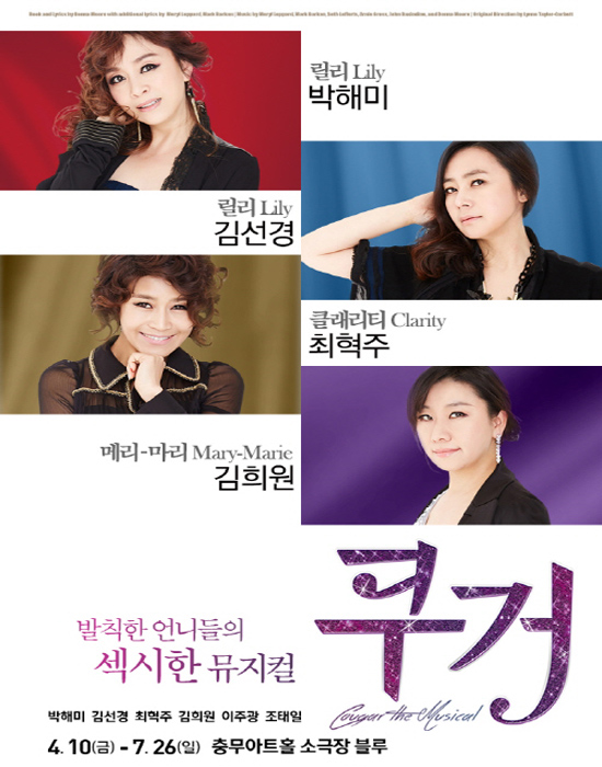 현실에 환멸을 느끼고, 섹시한 어린 남성에게 끌리기 시작하는 3명의 여성들이 자신들의 행복과 성적만족감을 위해 형성한 쿠거 커뮤니티 안에서 펼쳐지는 인생과 우정, 행복 그리고 사랑이야기를 그려내며, 한국판 ‘섹스 앤 더 시티’로 불리는 뮤지컬 ‘쿠거’는 노골적이며 대담한 여자들의 진짜 이야기를 유쾌하게 풀어낼 것입니다.