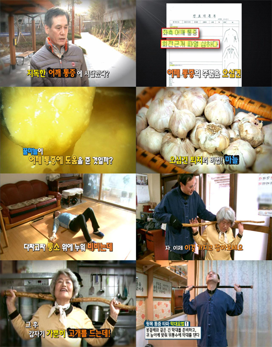 그가 제시한 오십견 퇴치 비법의 일등 공신은 바로 ‘꿀마늘’. 살짝 찐 마늘을 일정량의 꿀과 함께 버무려 식후 소량씩 섭취하면 되는데, ‘꿀마늘’의 주재료가 되는 마늘에는 알리신 이라는 성분이 있어 근육의 피로 물질인 젖산을 배출하는 효과가 있다는 것입니다.