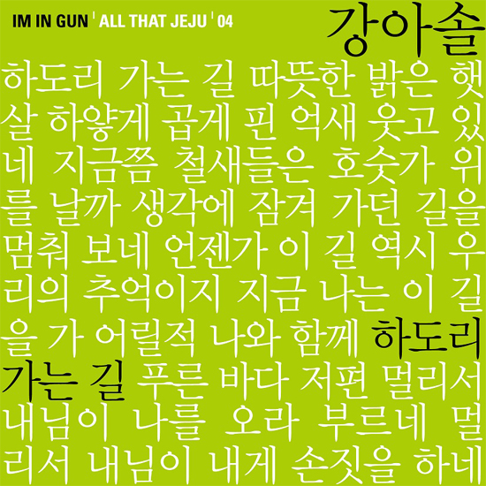 [쿠키뉴스=콘텐츠기획팀] 임인건의 ‘All that Jeju’ 프로젝트 앨범 중 장필순, 정준일, BMK에 이어 네 번째 곡으로 강아솔이 ‘하도리 가는 길’을 9일 각 음원사이트를 통해 발표했습니다.