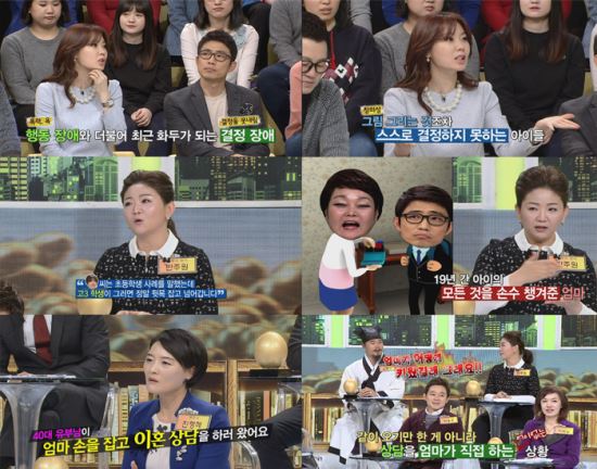 또 변호사 진형혜는 “결정장애는 비단 청소년들의 이야기만은 아니다. 이혼을 고민하는 40대 남성이 엄마 손을 잡고 이혼 상담을 받으러 오는 경우도 봤다.”며 성인이 돼서도 부모님에게 의존하는 삶을 사는 사례를 공개했다. 이어 “그때는 같이 오기만 한 게 아니라, 상담을 엄마가 직접 하는 어이없는 상황이었다. 엄마와 함께 상담을 받으러 오는 남자들 중, 상담 내내 말 한마디 안하고 엄마만 혼자 이야기 하다가 돌아가는 경우도 많다. 결정장애뿐만 아니라, 지적장애가 있는 건 아닌지 의심하기도 했다.”고 말해 스튜디오를 충격에 빠뜨렸습니다.