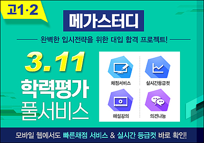 한편 메가스터디는 고1 및 고2 학생들을 위한 3월 학력평가 등급컷 서비스도 11일 저녁부터 온라인과 모바일을 통해 무료로 제공할 예정이다. epi0212@kmib.co.kr