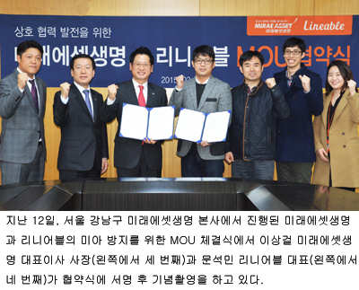 [쿠키뉴스=박주호 기자] 미래에셋생명은 지난 12일 서울 강남구 미래에셋생명 본사에서 국내 웨어러블(wearable, 착용하는) 벤처기업인 리니어블(Lineable)과 업무협약(MOU)을 체결했다고 밝혔다.