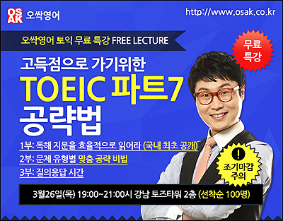 한편 오싹영어는 인강 홈페이지 오픈을 기념하기 위해 특별 이벤트를 진행한다. 회원가입 시 모의고사 5세트 및 기출단어테스트 45회차를 제공한다. 또 취업 전문 컨선털트의 취업 강의 및 영어인터뷰 등의 서비스도 무료로 받을 수 있다. 아울러 오싹영어는 회원가입 고객들에게 토익필수자료 및 적립금 증정 이벤트와 함께 오싹영어 핵심 강의를 무료로 체험할 수 있는 기회도 제공한다. 오는 26일 오후 7시에는 강남역에서 고득점으로 가기 위한 토익 파트7 공략법 무료특강을 진행한다. epi0212@kmib.co.kr