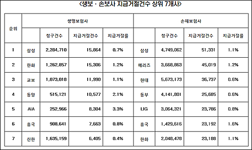 또 지급거절률이 높은 보험사는 생보사 AIA KDB 동양, 손보사 흥국 메리츠 한화 순으로 나타났다.