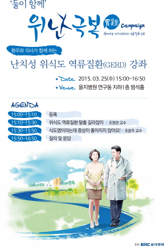 이번 건강강좌는 ▲위식도 역류질환 탈출 길라잡이(소화기내과 조영관 교수) ▲식도염이라는데 증상이 좋아지지 않아요(소화기내과 조윤주 교수) 등 난치성 위식도 역류질환의 이해를 돕기 위한 건강강좌와 질의 및 응답시간으로 구성된다. (문의: 을지병원 소화기내과 02-970-8209) kubee08@kukimedia.co.kr
