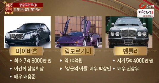 방송에 따르면 ‘욘사마’ 배용준은 가격이 6~7억원에 달하는 마이바흐를 탄다. 이 차량은 삼성 이건희 회장의 차량이기도 하다. 영화 ‘장군의 아들’에 출연한 배우 박상민 10억원에 이르는 람보르기니를, 장동건은 포르쉐 카레라를 소유한 것으로 전해졌다.