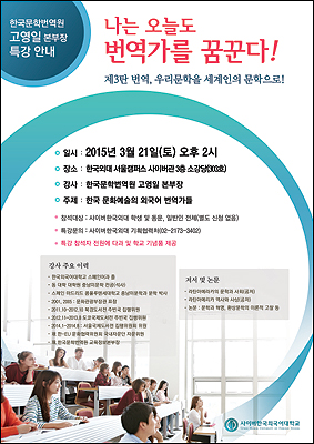 이번 특강은 <나는 오늘도 번역가를 꿈꾼다> 번역가 릴레이 특강의 마지막 강의로 ‘한국 문화예술의 외국어 번역가들’이라는 주제로 진행된다.