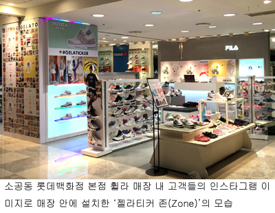 스포츠 브랜드 휠라(FILA)의 ‘SNS 이벤트 응모작 매장 전시’가 화제다. 고객들이 휠라 공식 인스타그램 ‘젤라티커’ 이벤트에 직접 찍어 응모한 이미지를 한데 모아 서울 소공동 롯데백화점 본점 휠라 매장 VMD(비주얼 머천다이징)에 적용, ‘젤라티커 존(Zone)’을 구성한 것이다.