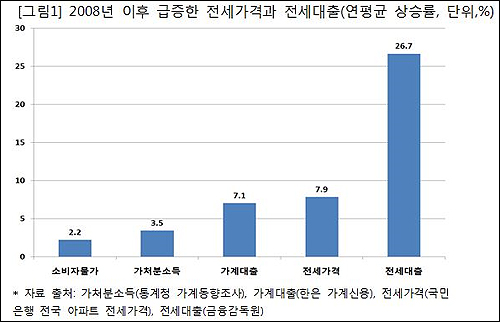 전세대출이 급증한 것은 ‘빚내서 집사라’는 박근혜정책의 부동산정책 실패에서 비롯된다고 김 의원은 지적했다. 2008년 금융위기 이후 6년 동안 전국 전세가격은 44%(아파트 58%) 증가했다. 이는 같은 기간 물가상승률(14.1%)의 3배가 넘는 수준이다. 전세가격이 연평균 6.3%(아파트 7.9%) 상승한 점을 감안하면 2년마다 계약이 갱신될 때마다 기존 전세금의 15% 정도를 추가로 마련해야 하는 부담을 지게 되는 셈이다.
