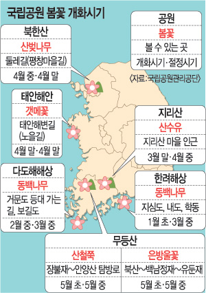 [쿠키뉴스=이영수 기자] 낮 기온이 20도를 넘나드는 완연한 봄이 왔다. 어디에 가야 봄꽃을 제대로 즐길 수 있을까. 국립공원관리공단은 봄꽃 나들이객을 위해 국립공원에서 즐길 수 있는 봄꽃의 종류와 개화 시기, 장소를 20일 공개했다.
