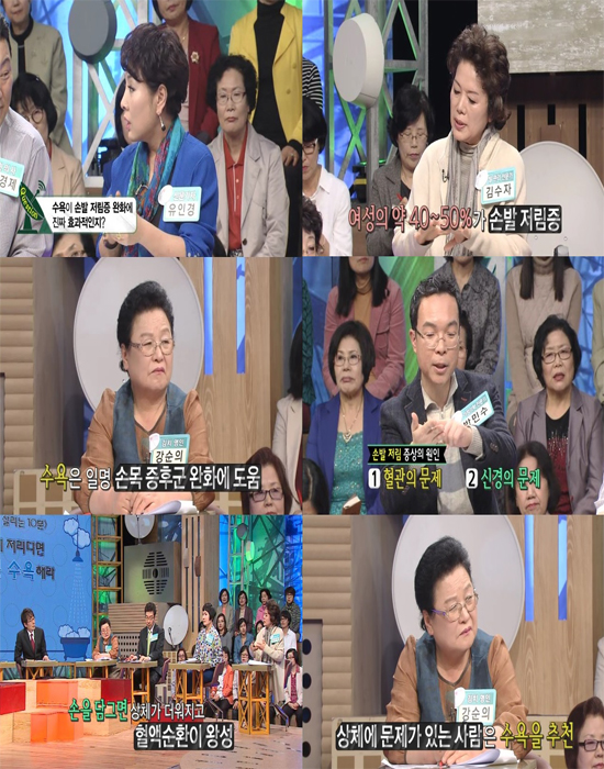 이때 혈액순환이 잘 안 되는 사람일수록 뜨거움을 느끼지 못하는데, 가정의학 전문의 박민수 멘토는 “손발 저림 증상은 혈관과 신경의 문제다. 이때 수욕을 해주면 ‘VDT 증후군(손끝이 파랗게 변하다가 하얗게 변하면서 통증을 유발하는 증세)’과 주부 또는 컴퓨터를 자주 사용하는 직장인들 사이에서 흔히 일어나는 ‘레이노 증후군’(추운 곳에 나가거나 과도한 스트레스 때문에 손가락, 발가락, 코, 귀 등의 끝 부분에 혈관이 수축하여 혈액순환장애를 일으키는 증세)을 예방할 수 있다.”고 전했습니다.