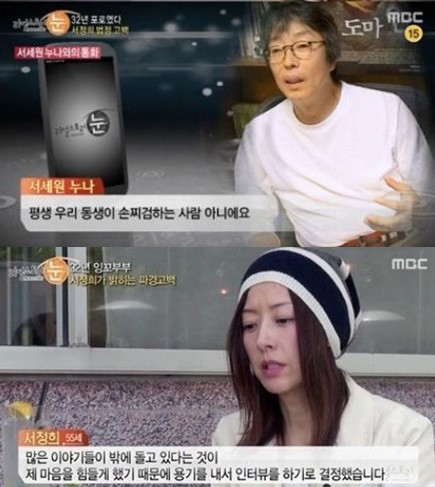 서세원의 친누나 역시 “부부가 다 싸움을 하는 것”이라며 “서정희가 이러고저러고 그런 말 하면 안 된다”고 동생을 두둔했다. 이어 “때리지도 않았는데 때렸다고 한다”며 “우리 동생은 평생 손찌검하는 사람 아니다”라고 강조했다.