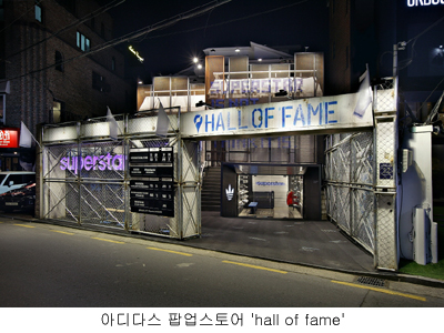 최근 가로수길에 문을 연 아디다스 오리지널스의 팝업스토어 ‘Hall of Fame’은 총 3층 규모로 1970년대부터 오랜 사랑을 받아온 아이콘적인 스니커즈 슈퍼스타(superstar)만을 위한 공간이다. 1층은 슈퍼스타 제품을 직접 착용, 구매할 수 있는 매장과 자신의 슈퍼스타를 가져오면 깨끗이 닦아주는 등 특별한 행사를 진행하는 공간으로 꾸며졌다. 2층과 3층에는 슈퍼스타를 활용한 국내 포토그래퍼의 작품 및 일러스트레이션, 베컴, 리타 오라, 씨엘, 듀스의 포트레이트, 패션화보 등이 전시된다. 슈퍼스타의 히스토리와 슈퍼스타와 함께 해 온 아티스트들의 작품까지 감상 할 수 있는 복합 문화 공간으로 오는 4월 19일까지 소비자들을 만난다.