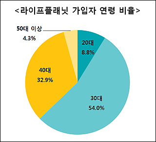 연령별 가입자 비율을 보면 30대가 54.0%로 가장 높았고 이어 40대(32.9%), 20대(8.8%), 50대 이상(4.3%)의 순이었다. 20~40대 고객 비율이 95.7%에 달했다.